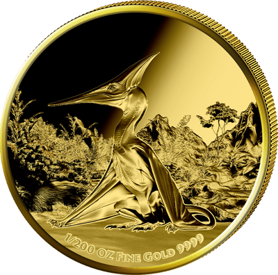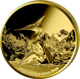 Besonders bemerkenswert: Die kunstvolle Gestaltung nutzt die glänzende Goldoberfläche perfekt aus. Durch den Kontrast zwischen polierten und mattierten Bereichen entsteht eine dreidimensionale Wirkung, die den Pteranodon förmlich aus der Münze hervortreten lässt.