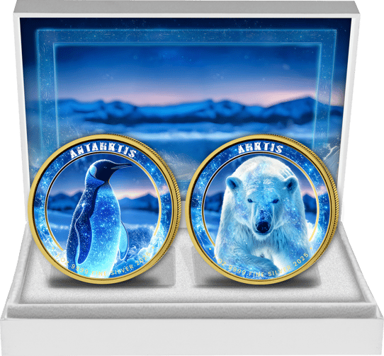 Die beiden Silbermünzen zeigen in atemberaubender Detailtreue die faszinierende Tierwelt der Polarregionen. Ein majestätischer Eisbär mit seinem Jungen sowie ein eleganter Pinguin werden durch die aufwendige Colorierung und partielle Goldveredelung zum Leben erweckt. Die eisblau schimmernden Farbtöne verschmelzen harmonisch mit dem glänzenden Silber und den goldenen Akzenten – ein visuelles Meisterwerk!
