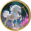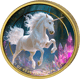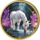Magische Kunstfertigkeit: Atemberaubende Colorierung mit mystischer Kristalllandschaft und majestätischem Einhorn, veredelt durch elegante Teilvergoldung des Münzrandes