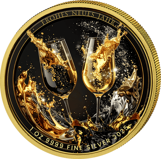 Die Vorderseite dieser außergewöhnlichen Silbermünzen zeigt zwei elegant geschwungene Champagnergläser, die in einem festlichen Anstoß zusammenkommen. Der goldene Champagner spritzt dynamisch aus den Gläsern – eingefangen in einem Moment purer Lebensfreude. Die Inschrift „FROHES NEUES JAHR" krönt das Motiv, während die Angaben „1 OZ 9999 FINE SILVER 2025" die technischen Spezifikationen dokumentieren.