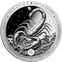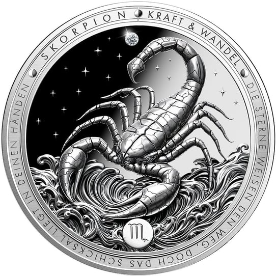 Die Vorderseite dieser außergewöhnlichen Münze zeigt einen detailreich gestalteten Skorpion, der sich majestätisch über kunstvoll gestaltete Wellen im barocken Stil erhebt. Jedes Segment des Panzers, jede Schere und der charakteristische Stachel wurden mit höchster Präzision in das edle Silber geprägt. Die Antik-Finish-Optik verleiht dem Relief eine fast skulpturale, dreidimensionale Wirkung, die jeden Betrachter in ihren Bann zieht.