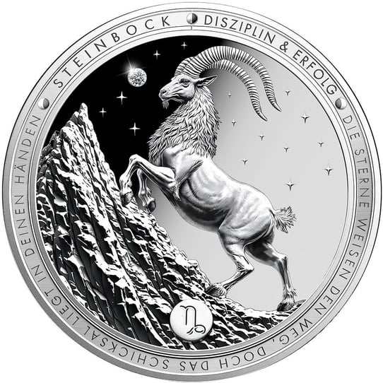 Diese inspirierende Umschrift auf dem breiten Münzrand unterstreicht die charakteristischen Eigenschaften des Sternzeichens Steinbock: Ausdauer, Zielstrebigkeit und der unerschütterliche Wille zum Erfolg. Der Hintergrund zeigt einen faszinierenden Übergang von tiefem Schwarz zu hellem Sternenhimmel – und mittendrin funkelt ein echter Diamant, der dieser Rarität ihren unvergleichlichen Charakter verleiht.