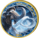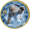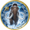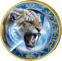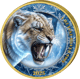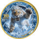 Der Säbelzahntiger präsentiert sich in seiner ganzen Wildheit: Mit weit aufgerissenem Maul und seinen charakteristischen, dolchartigen Eckzähnen scheint er direkt aus dem Eis zu springen. Die bläuliche Farbgebung und der umgebende Eisring verstärken die frostige Atmosphäre. Schneeflocken-Ornamente und filigrane Eiskristalle zieren den Rand und vollenden das winterliche Gesamtbild.