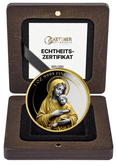 Meisterhafte Prägekunst: Die teilvergoldete Madonna mit Jesuskind in höchster Polierter Platte Qualität vereint Renaissance-Ästhetik mit 999,9er Feinsilber