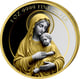 Die Bildseite dieser außergewöhnlichen Prägung zeigt die Jungfrau Maria, wie sie das Jesuskind liebevoll in ihren Armen hält. Die Darstellung erinnert an die großen Meisterwerke der Renaissance. Marias goldenes Gewand fließt in eleganten Falten herab, während ein strahlender Heiligenschein beide Figuren umgibt. Der kunstvolle Übergang von tiefem Schwarz zu strahlendem Silber im Hintergrund verleiht dem Motiv eine geradezu mystische Tiefe.