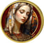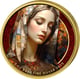 Der Schleier und die Gewandung präsentieren sich in einem faszinierenden Glasmosaik-Stil. Warme Erdtöne wie Orange, Braun und Beige verschmelzen harmonisch mit kühlen Blau- und Grautönen. Der tiefburgunderrote Hintergrund funkelt durch den eingearbeiteten Rubinstaub wie ein kostbarer Edelstein – ein Effekt, der diese Münze im wahrsten Sinne des Wortes zum Strahlen bringt.