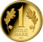 Die Vorderseite dieser Prägung besticht durch ihre kunstvolle Gestaltung. Eine imposante Ziffer "1" thront zentral auf dem Münzbild, flankiert von zwei symmetrisch angeordneten Eichenzweigen mit detailreich ausgearbeiteten Eicheln. Besonders reizvoll: Der linke Zweig hebt sich vor einem tiefschwarzen Hintergrund ab, während sein Pendant auf der rechten Seite vor goldenem Grund erstrahlt. Dieser Kontrast verleiht der Münze eine unverwechselbare Tiefe. Unterhalb prangt die Aufschrift "GOLD MARK" samt der Jahreszahl "2026". Ein eleganter Perlrand umrahmt das gesamte Kunstwerk.