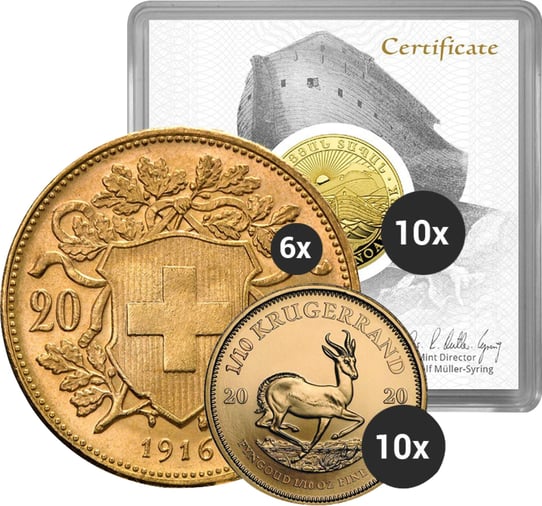 Dieses Paket beinhaltet den 1/10 Unze Gold Krügerrand zehnmal.