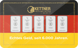Fünf hochwertige 1-Gramm-Silberbarren im praktischen Scheckkartenformat für maximale Flexibilität