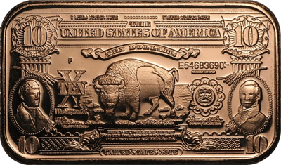 Die Vorderseite dieses beeindruckenden Barrens zeigt eine detailgetreue Wiedergabe des legendären 10-Dollar-Silberzertifikats „American Bison“ aus dem Jahr 1901, das als eines der ikonischsten Geldscheindesigns in den USA gilt. Mit seinem nostalgischen Charme und dem kraftvollen Bild des amerikanischen Bisons, der stolz in der Mitte des Zertifikats prangt, ist dieser Kupferbarren eine Hommage an eine Zeit, in der jedes Banknotendesign ein Kunstwerk war.