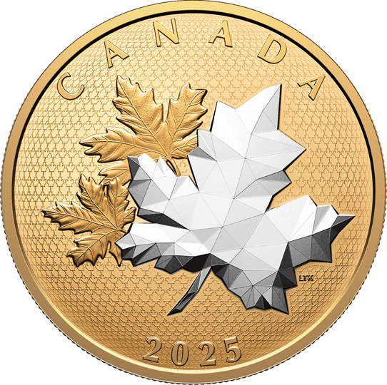 Das Herzstück dieser Münze ist das innovative geometrische Design in Polierter Platte-Qualität. Im Vordergrund präsentiert sich ein silberfarbenes Ahornblatt in moderner Facetten-Optik, das von zwei vergoldeten Ahornblättern kunstvoll umrahmt wird. Der vollständig vergoldete Hintergrund zeigt ein filigranes Muster aus kleinen Ahornblättern und unterstreicht die außergewöhnliche Ästhetik dieser Prägung.