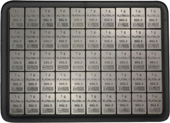 Ein Tafelbarren ist sozusagen ein großer Barren, der aus mehreren kleineren Barren besteht. Dieser Tafelbarren hier setzt sich aus fünfzig 1 Gramm schweren Platinbarren zusammen, die über Sollbruchstellen miteinander verbunden sind. Die einzelnen Barren können Sie ganz leicht abtrennen, ohne dabei den Tafelbarren zu beschädigen. Somit können Sie sich den Tafelbarren einteilen. Wenn Ihnen danach ist, dann können Sie eine beliebige Anzahl an Barren abtrennen und liquidieren. Somit haben Sie 50 Gramm Platin, aber müssen diese nicht auf einmal veräußern. Das ist in Krisenzeiten besonders nützlich, wenn sie die Tafelbarren dann nutzen möchten, um zu bezahlen. Der Tafelbarren ist außerdem günstiger als der Erwerb von fünfzig einzelnen Tafelbarren, die jeweils ein Gramm wiegen.