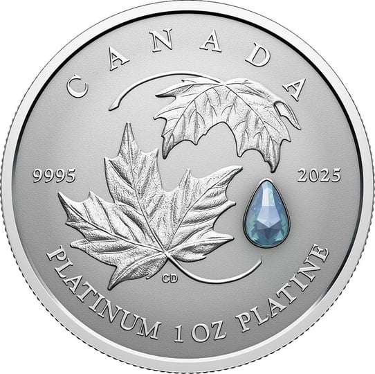 • Motiv: Die Münze vereint zwei kanadische Ahornblätter mit einem funkelnden 0,23-Karat Aquamarin in Tropfenform - eine symbolische Hommage an das lebensspendende Wasser der kanadischen Wälder