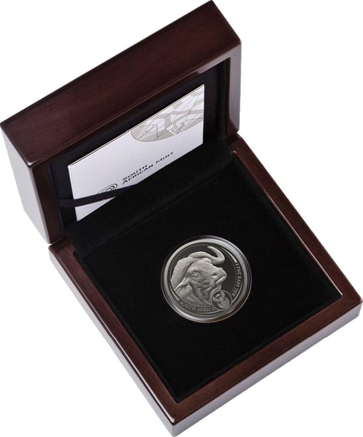 Die Präsentation der Münze erfolgt in einem edlen Etui, das die Exklusivität dieses Sammlerstücks unterstreicht. Das glänzende, silberne Finish der Münze und ihre sorgfältige Platzierung auf einem schwarzen Samtkissen in der hochwertigen, dunkelbraunen Holzbox machen diese Ausgabe zu einem echten Blickfang für jede Sammlung. Die auf dem Deckel angebrachte silberne Plakette mit der Aufschrift "SOUTH AFRICAN MINT" und einer stilisierten Darstellung eines Segelschiffes rundet das edle Gesamtbild ab.
