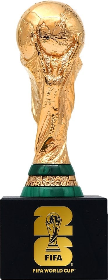 - Motiv: Dreidimensionale Nachbildung des ikonischen WM-Pokals mit 85 mm Höhe, vergoldet auf 999er Feinsilber, auf elegantem Sockel mit FIFA World Cup 26™-Logo