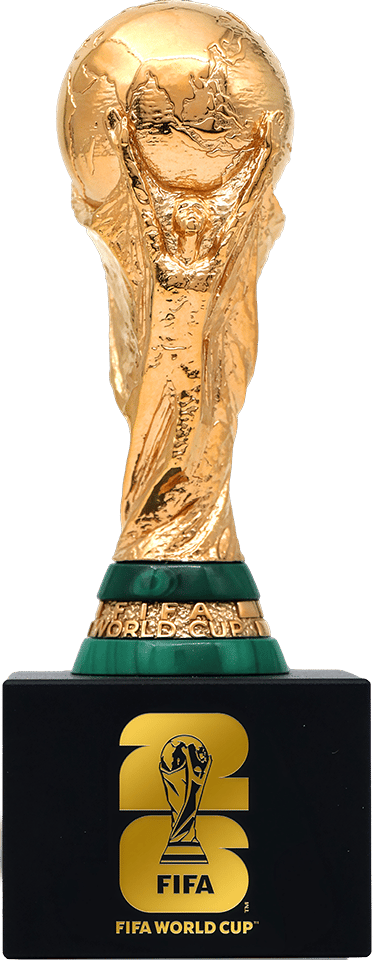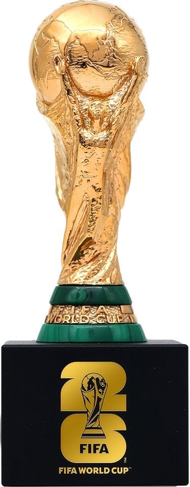 Der FIFA WM-Pokal gehört zu den ikonischsten Trophäen der Sportgeschichte. Seit 1974 recken die Sieger der Fußball-Weltmeisterschaft genau diese Figur in den Himmel – zwei menschliche Gestalten, die triumphierend den Erdball emporheben. Jetzt können Sie dieses Symbol des ultimativen sportlichen Triumphs in Ihren Händen halten. Die 150 mm hohe Replik thront auf einem eleganten schwarzen Sockel, der das offizielle FIFA World Cup 26™-Logo in Gold trägt. Jedes Detail – von den geschwungenen Linien der Figuren bis hin zum grün schimmernden Malachit-Band am Fuß – wurde mit höchster Präzision nachgebildet.
