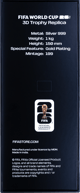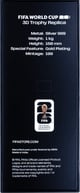 Die Replik wird in einer exklusiven Originalverpackung geliefert, die dem Prestige dieses Stücks in jeder Hinsicht gerecht wird. Die elegante, dunkel gehaltene Box mit dem offiziellen FIFA World Cup 26™-Branding schützt das Sammlerstück nicht nur, sondern unterstreicht seinen Charakter als Premium-Produkt. Auf der Rückseite der Verpackung finden sich sämtliche Spezifikationen – von der Silberreinheit über die Höhe bis zur Mintage-Zahl – sowie der Hinweis auf die offizielle FIFA-Lizenz.