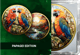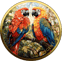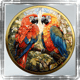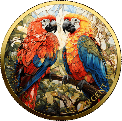 • checkmark greenKunstvoll veredelte Silbermünze mit farbenprächtigen Papageien im einzigartigen Buntglas-Design