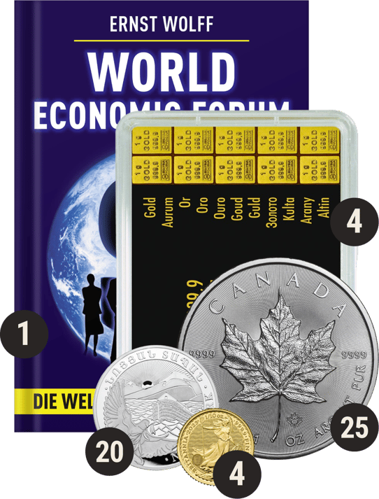 Erweitern Sie jetzt mit dem exklusiven Produkt Krisen-Absicherung (Paket M) Ihr Anlageportfolio! Der besondere Paketinhalt mit den einmaligen Arche Noah, Maple Leaf und Britannia Münzen sowie dem Valcambi Tafelbarren und dem vielfältigen World Economic Forum Buch von Ernst Wolff, wird jeden Anleger begeistern. Egal ob Sie sich für biblische Geschichte in Münzform, das Symbol für die kanadische Kultur in Form der Maple Leaf oder ein reines Edelmetall mit hoher Wertsteigerung sowie für die Informationen über die internationale Zusammenarbeit interessieren. In diesem einzigartigen Paket zur Krisenabsicherung erhalten Sie alles. Sichern Sie sich jetzt mit diesem exklusiven Kettner-Edelmetalle Paket Ihre Zukunft und werden Sie Teil einer aufregenden Welt der Edelmetalle.