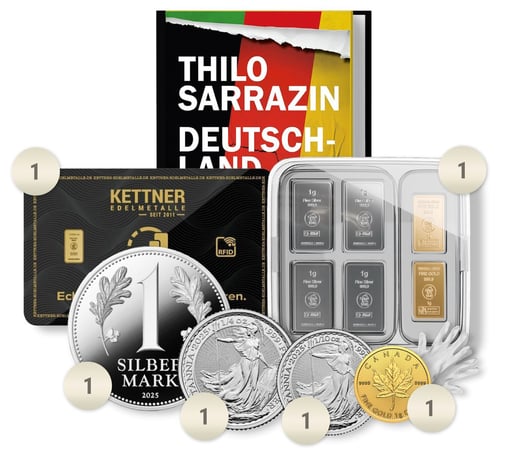 - Zusätzliche Gratiszugaben eine limitierte 1 Unze 999er Fine Silber Mark Medaille mit höchster Prägequalität Polierte Platte, Baumwoll Münzhandschuhe und 1 Buch von Dr. Thilo Sarrazin