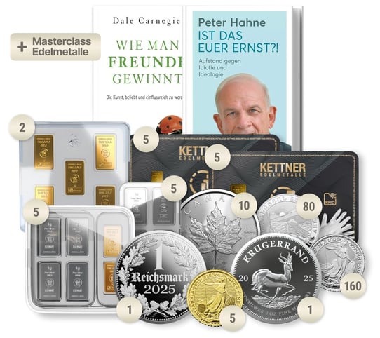 - Zusätzliche Gratiszugaben sind eine limitierte 1 Unze Silber Reichsmark Medaille aus 999er Fine Silber in höchster Prägequalität Polierte Platte PP, Münzhandschuhe, die Zugangskarte für die Kettner Edelmetalle Masterclass, sowie ein Buch von Peter Hahne (handsigniert) und ein Buch von Dale Carnegie.