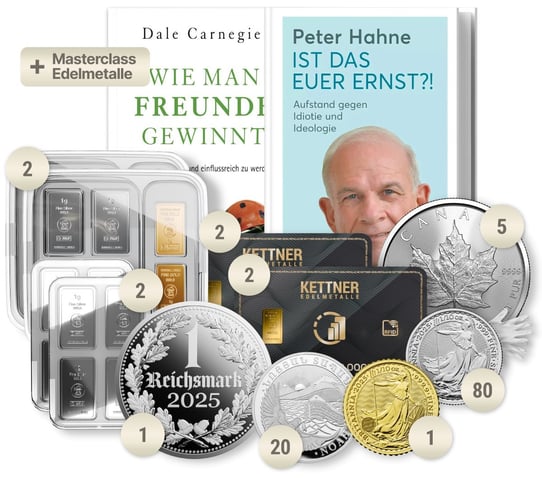 4. Zusätzliche Gratiszugaben sind eine limitierte 1 Unze Silber Reichsmark Medaille aus 999er Fine Silber in höchster Prägequalität Polierte Platte PP, Münzhandschuhe, die Zugangskarte für die Kettner Edelmetalle Masterclass, sowie ein Buch von Peter Hahne und ein Buch von Dale Carnegie.