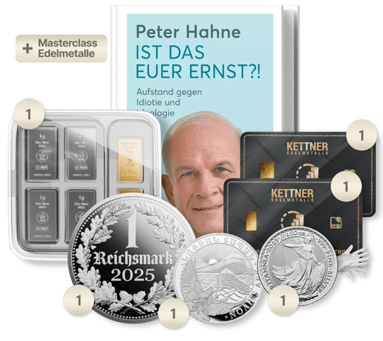 4. Zusätzliche Gratiszugaben sind eine limitierte 1 Unze Silber Reichsmark Medaille aus 999er Fine Silber in höchster Prägequalität Polierte Platte PP, Münzhandschuhe, die Zugangskarte für die Kettner Edelmetalle Masterclass, sowie ein Buch von Peter Hahne.