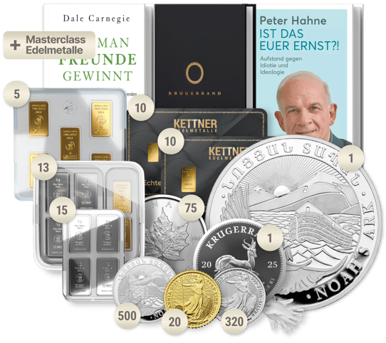 - Zusätzliche Gratiszugaben sind Münzhandschuhe, die Zugangskarte für die Kettner Edelmetalle Masterclass, sowie ein Buch von Peter Hahne (handsigniert) und ein Buch von Dale Carnegie. Außerdem ein exklusives Exemplar des Krugerrand Golden Jubilee von Francois Malan.