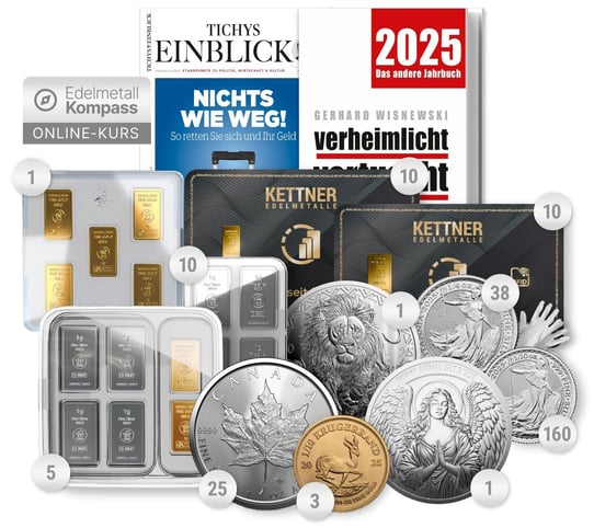 Das Krisenschutz Paket L vereint substantiellen Vermögensschutz mit strategischer Flexibilität. Die außergewöhnliche Auswahl der Stückelungen bietet Ihnen maximalen Inflationsschutz - von der sofort verfügbaren Krisenwährung bis zur langfristigen Vermögenssicherung. Die Premium-Kombination aus international anerkannten Münzen und hochwertigen Barren gewährleistet Ihre finanzielle Unabhängigkeit auf höchstem Niveau.