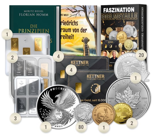 Mit unserem strategisch konzipierten Paket Selbstverteidigung M bieten wir Ihnen maximale Sicherheit durch eine perfekt ausbalancierte Kombination aus Gold und Silber. . Die sorgfältig gewählten Stückelungen vereinen optimalen Inflationsschutz mit der Flexibilität eines praktischen Tauschmittels – ideal für alle, die in unsicheren Zeiten auf echte Werte setzen.