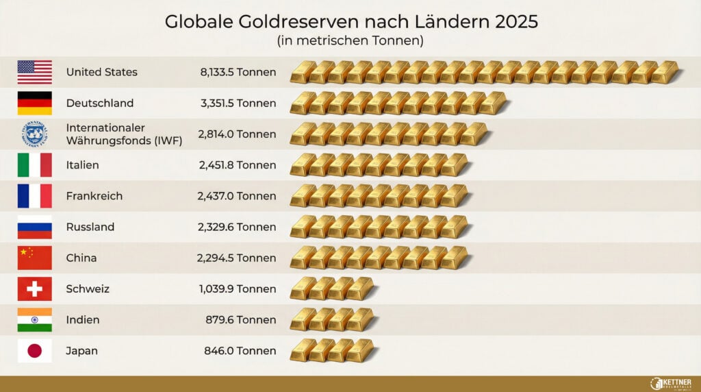 Die größten Goldreserven der Welt liegen in den Zentralbanken. Die USA führen die Liste an, gefolgt von Deutschland und Italien. Deutschland hält rund 3.352 Tonnen Gold als Teil seiner Währungsreserven. Die Bundesbank hat begonnen, einen Großteil ihres Goldes nach Deutschland zu bringen, und lagert nun einen beträchtlichen Teil davon in Frankfurt am Main. China und Russland haben in den vergangenen Jahren massiv Gold zugekauft und ihre offiziellen Zahlen sollten deutlich weniger Gold anzeigen, als tatsächlich in den Reserven zu finden ist.