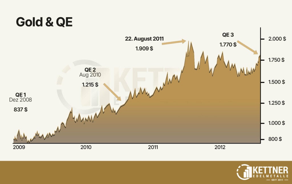 Durch die Finanzkrise, die von der USA ausgehend die Welt ergriffen hatte, entwickelte sich immer mehr zu einem handfesten Problem in Europa. Die hohen Verschuldungen und Wirtschaftsprobleme von Irland, Portugal, Spanien, Italien und vor allem die Staatsschuldenkrise Griechenlands stürzten die Euroländer in die Krise. Von 2009 bis 2011 notierte der Goldkurs bei mehr als 1.900 Euro. Bis Mitte 2013 fiel er dann wieder auf 1.200 US-Dollar und bewegte sich bis zum Ende des Jahrzehnts mit all seinen Aufs und Abs prinzipiell seitwärts.