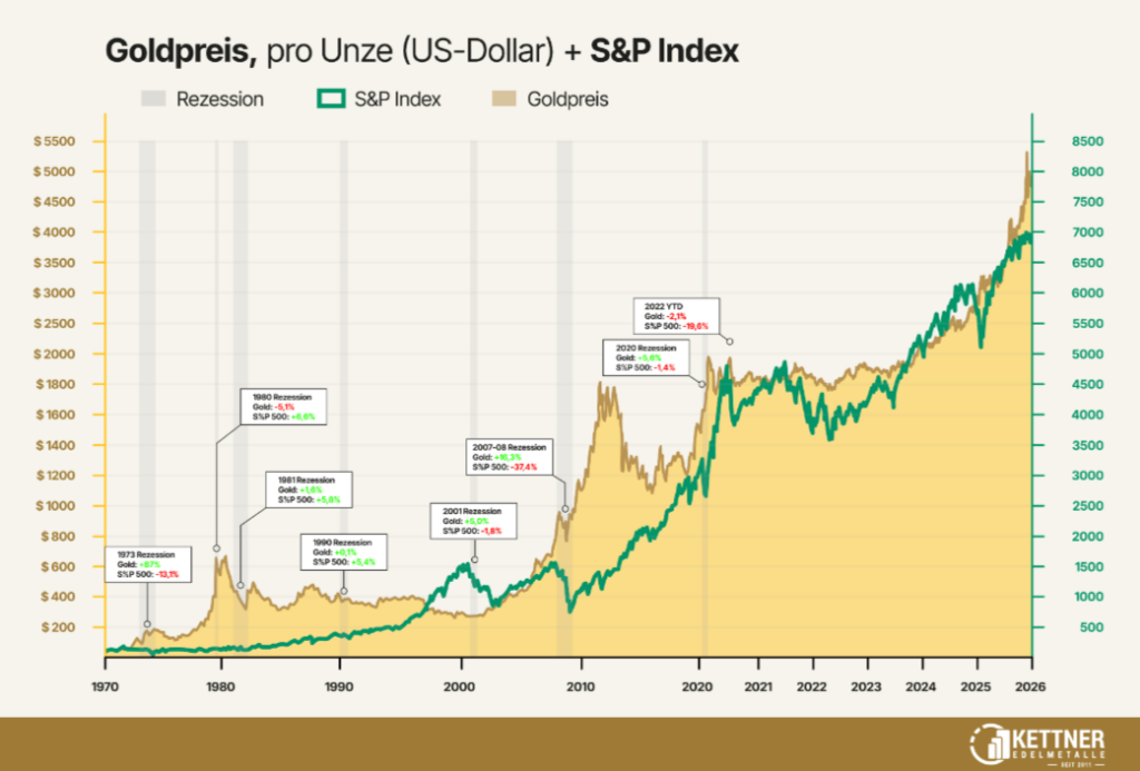 Die Stärke von Gold zeigt sich nicht allein in schweren Krisen, sondern auch in Rezessionsphasen. In solchen Zeiträumen zurückgehender Wirtschaftsleistung hat Gold in mehr als 50 Jahren in der Regel gut performt.