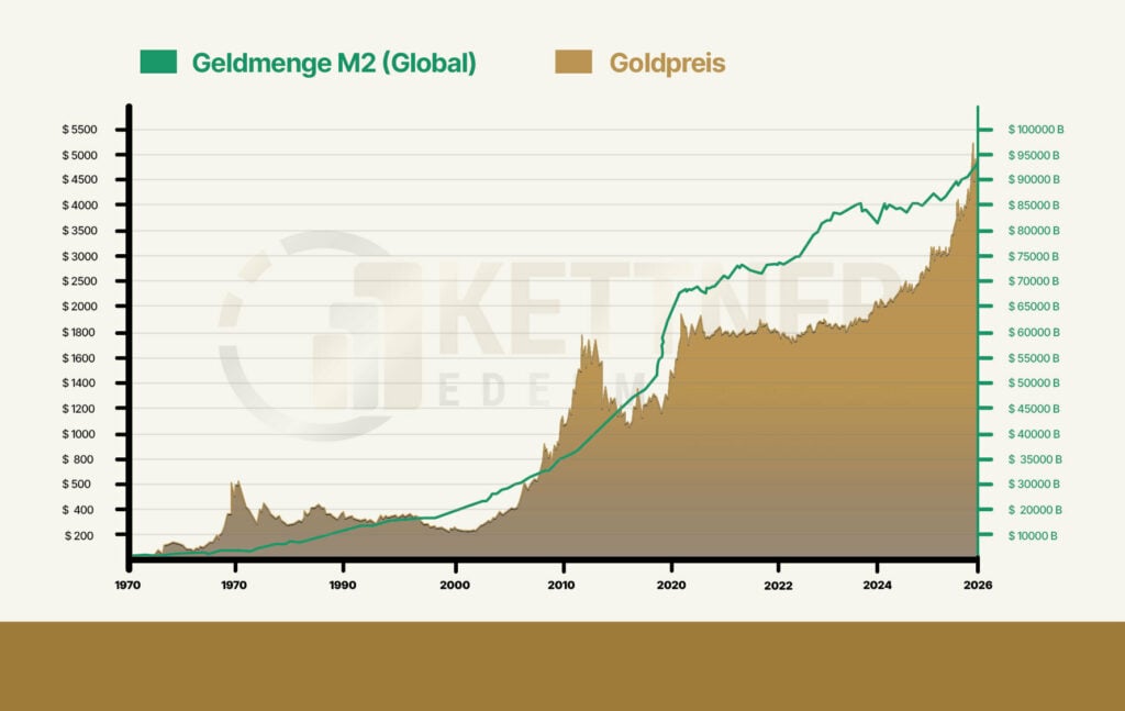 Die offiziellen Zahlen erzählen dabei nie die ganze Geschichte. Zentralbanken kaufen im Verborgenen, OTC-Märkte entziehen sich der Statistik, und die psychologische Komponente treibt Preise in Höhen, die kein Lehrbuch vorhersagen kann. Das eigentliche Fundament des Goldpreises aber liegt tiefer: Jede Ausweitung der Geldmenge, jede neue Billion an Staatsschulden, jede Zinssenkung ist ein stilles Argument für das Edelmetall – nicht weil Gold im Wert steigt, sondern weil Papiergeld an Wert verliert. Dieser Zusammenhang ist so alt wie das Geld selbst und hat sich in jeder großen Krise der Moderne bestätigt.