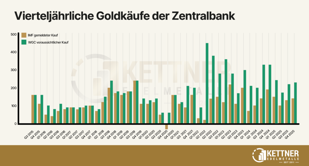 Zentralbanken: 17,3 Prozent der Nachfrage kam durch die Zentralbanken zustande. Dass die Zahlen nicht immer stimmen müssen, zeigt China. Offiziell hat es 2025 nur 25,87 Tonnen gekauft, aber Goldman Sachs, Bloomberg und Kobeissi Letter gehen von 270 Tonnen – also mehr als dem 10-fachen – aus. Doch zu dieser Thematik im Laufe des Artikels noch mehr.