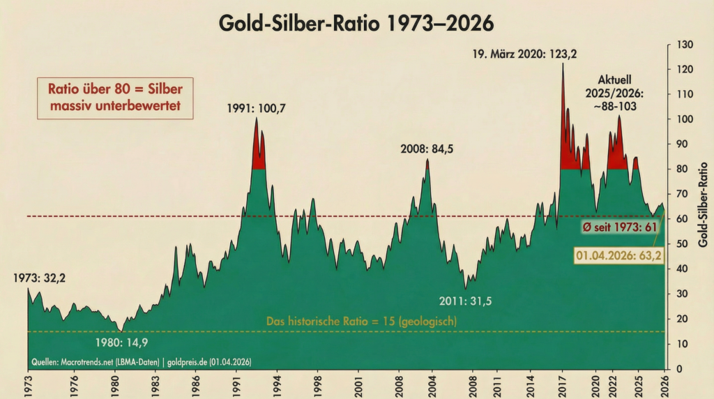 Wenn man die industrielle Bedeutung und das begrenzte Recycling von Silber betrachtet, ergibt sich ein Bild, das Silber als das seltenere und unterbewertete Metall erscheinen lässt. Bei einem aktuellen Gold-Silber-Ratio von etwa 63 (Stand: 31. März 2026) könnte Silber deutlich unterbewertet sein, wenn man seine industrielle Bedeutung und die begrenzten Recyclingmöglichkeiten berücksichtigt.