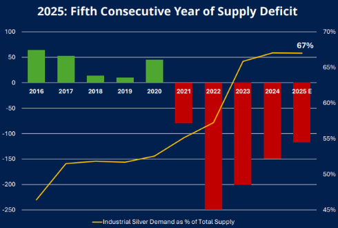 Die Nachfrage nach Silber in der Industrie steigt stetig, insbesondere durch die Zunahme der Nutzung erneuerbarer Energien (z.B. Photovoltaik und Hausakkus), die Nutzung höchst energieintensiver KI-Technologien oder die Elektrifizierung von Fahrzeugen. Diese industrielle Nachfrage erhöht den Verbrauch und verringert die verfügbaren Silberbestände, was langfristig zu einer Verknappung führt. Vor allem, weil das Silberangebot seit Jahren auf ungefähr dem gleichen Niveau verharrt: