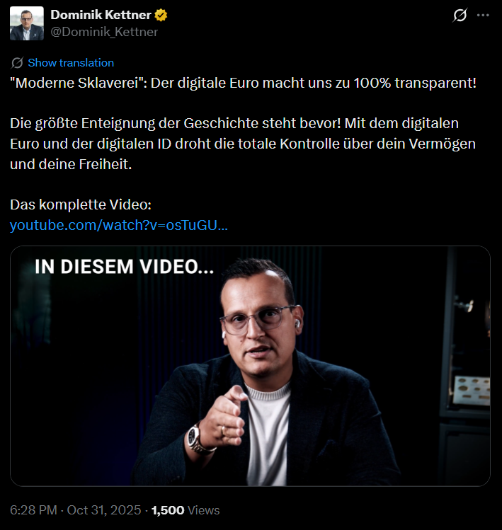 Kostenloses Live-Webinar: Dominik Kettner und 6 hochkarätige Gäste enthüllen, wie digitaler Euro, verpflichtende digitale ID und das geplante EU-Vermögensregister Ihr Erspartes bedrohen – und welche konkreten Schritte Sie jetzt unternehmen müssen, um Ihr Vermögen zu schützen.