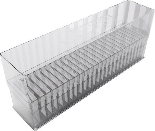 Die Masterbox ist aus robustem, transparentem Kunststoff gefertigt, was nicht nur für eine ansprechende Optik sorgt, sondern auch den Inhalt sichtbar macht, ohne die Box öffnen zu müssen. Dies erleichtert die Identifikation und den Zugang zu Ihren UnityBars erheblich.