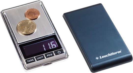 Die hier angebotene Digitalwaage für Münzen ist 12 cm breit und 8 cm lang, (Das entspricht 120 mm x 80 mm). Damit ist sie als Waage im Taschenformat ausgelegt und somit auch für den mobilen Gebrauch tadellos geeignet. Die Digitalwaage für Münzen wird mit zwei Batterien á 1,5 Volt im Format AAA betrieben. Die Batterien sind im Lieferumfang enthalten. Der Hersteller der Digitalwaage für Münzen ist die renommierte Firma „Leuchtturm“, die Artikelbezeichnung lautet „Mobil 007“. Die Messtoleranz beträgt +/- 0,03 Gramm und ist damit speziell für Münzgewichte ausgelegt. Die Digitalwaage für Münzen ist besonders formschön gestaltet, hat ein ansprechendes LCD-Display und einen fest zu verschließenden Deckel, der diese Waage nicht nur vom Design, sondern auch von der Funktionalität auszeichnet.